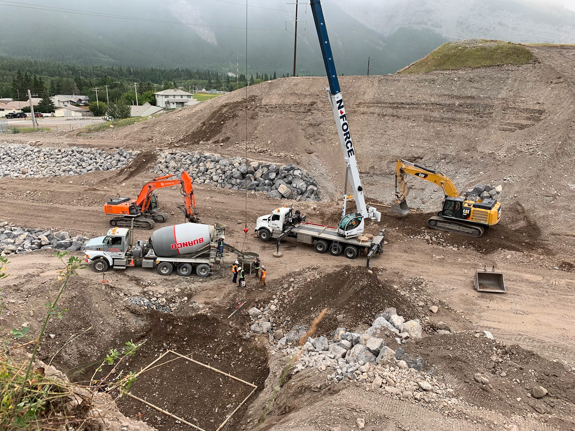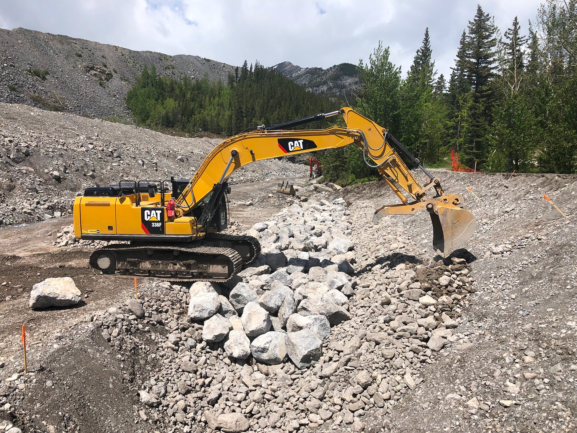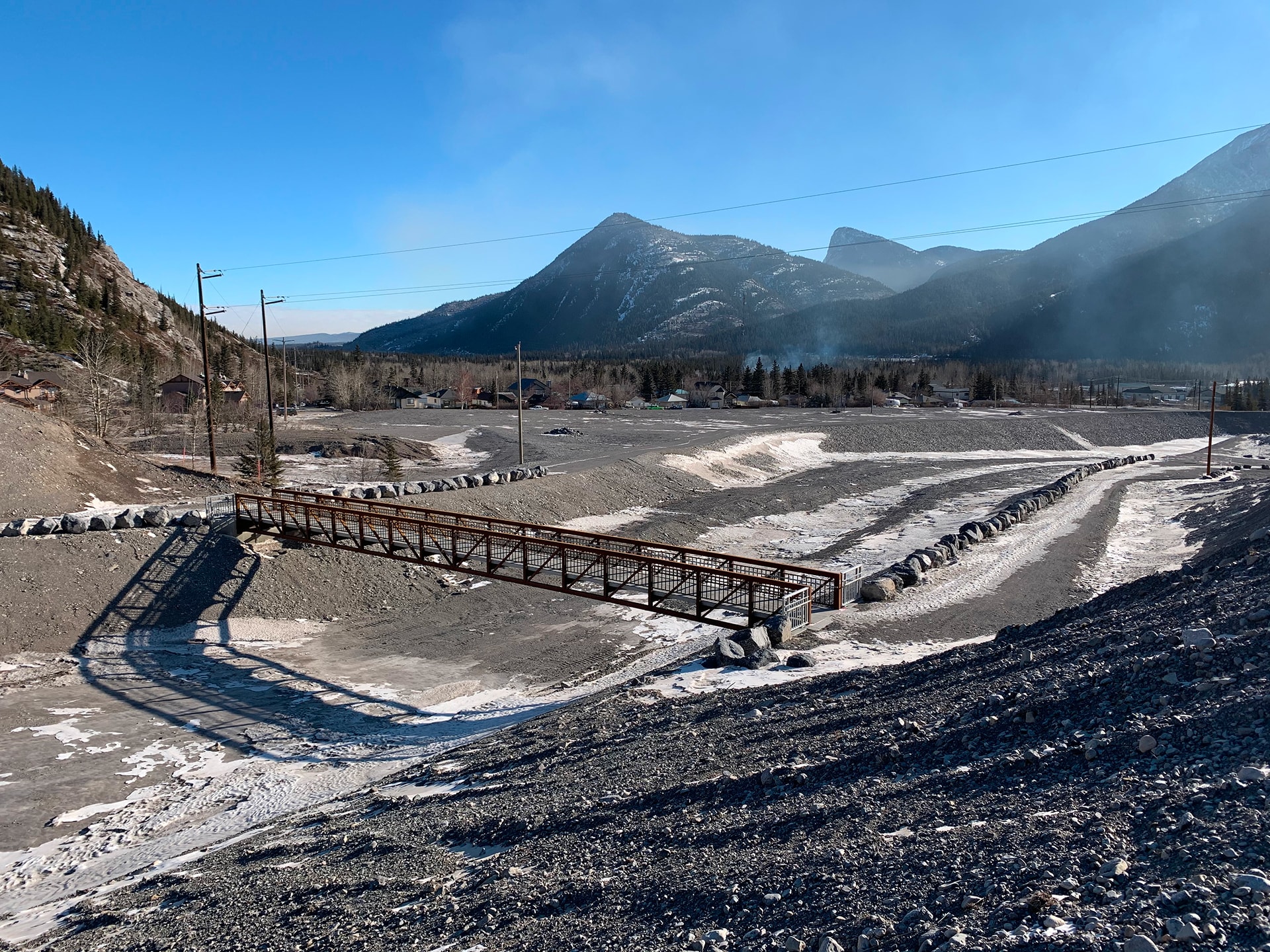 Devcon reinforced the creek banks with heavy riprap armour from the upstream reaches to the Bow River confluence, providing reinforcement for protection against erosion and high-flow events. Crews built a large sediment trap to control sediment and reduce downstream buildup. In high-risk areas—especially beneath channel crossings—they installed articulating concrete mattresses for flexible, durable reinforcement. We upgraded the site infrastructure, redesigning and installing a new pedestrian bridge to ensure safe public access. In addition, crews constructed a debris-retention structure to prevent large materials from blocking the channel or damaging downstream structures during peak flows.