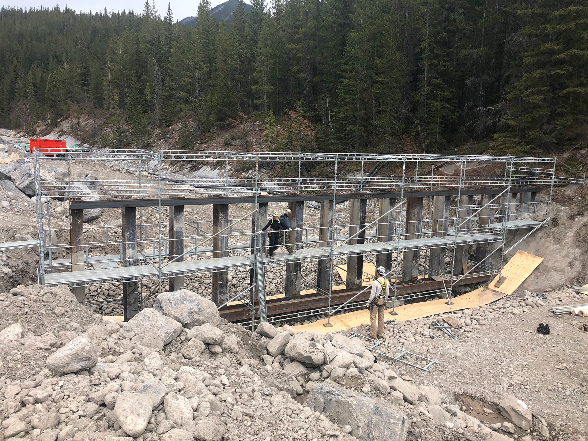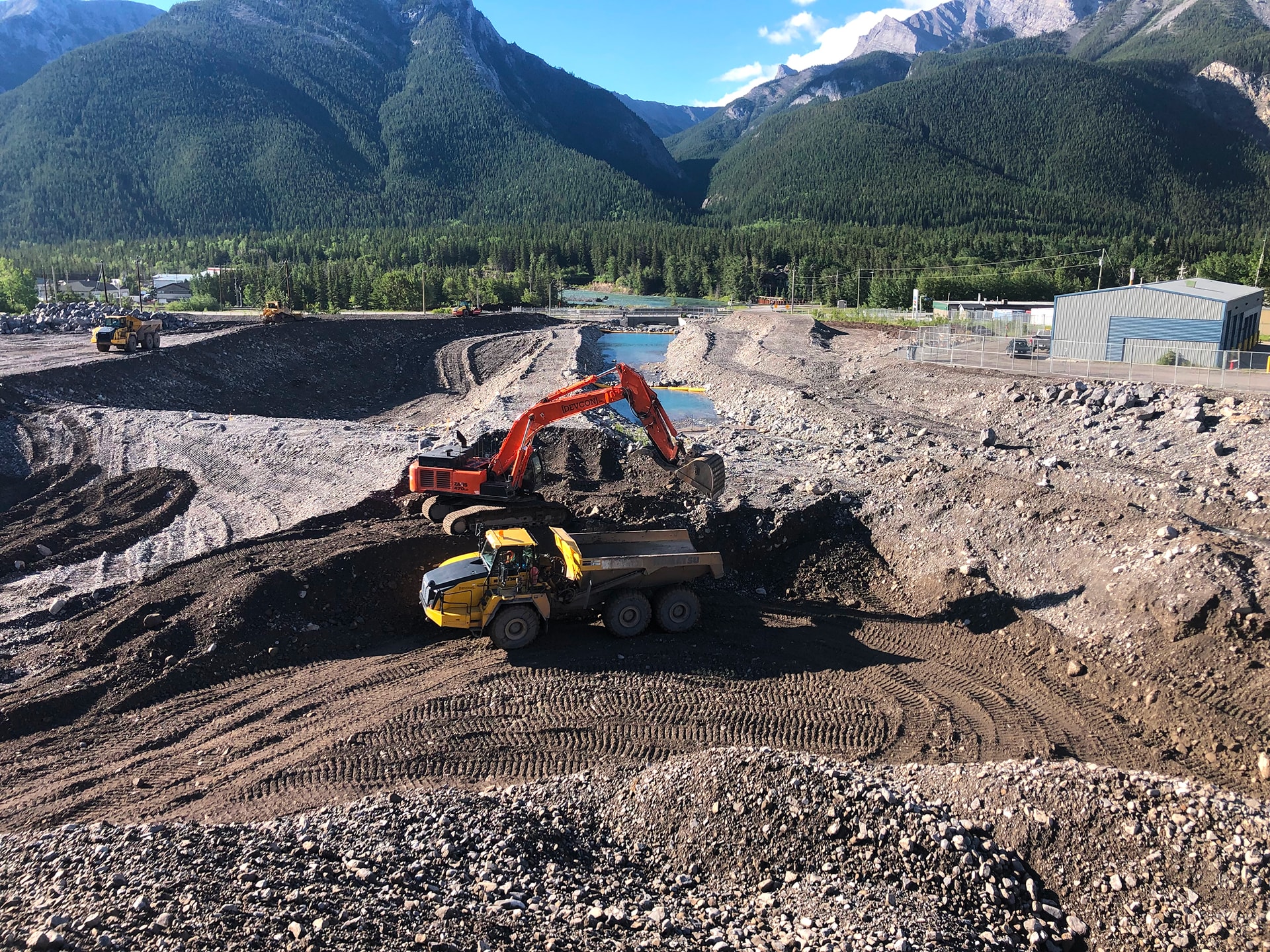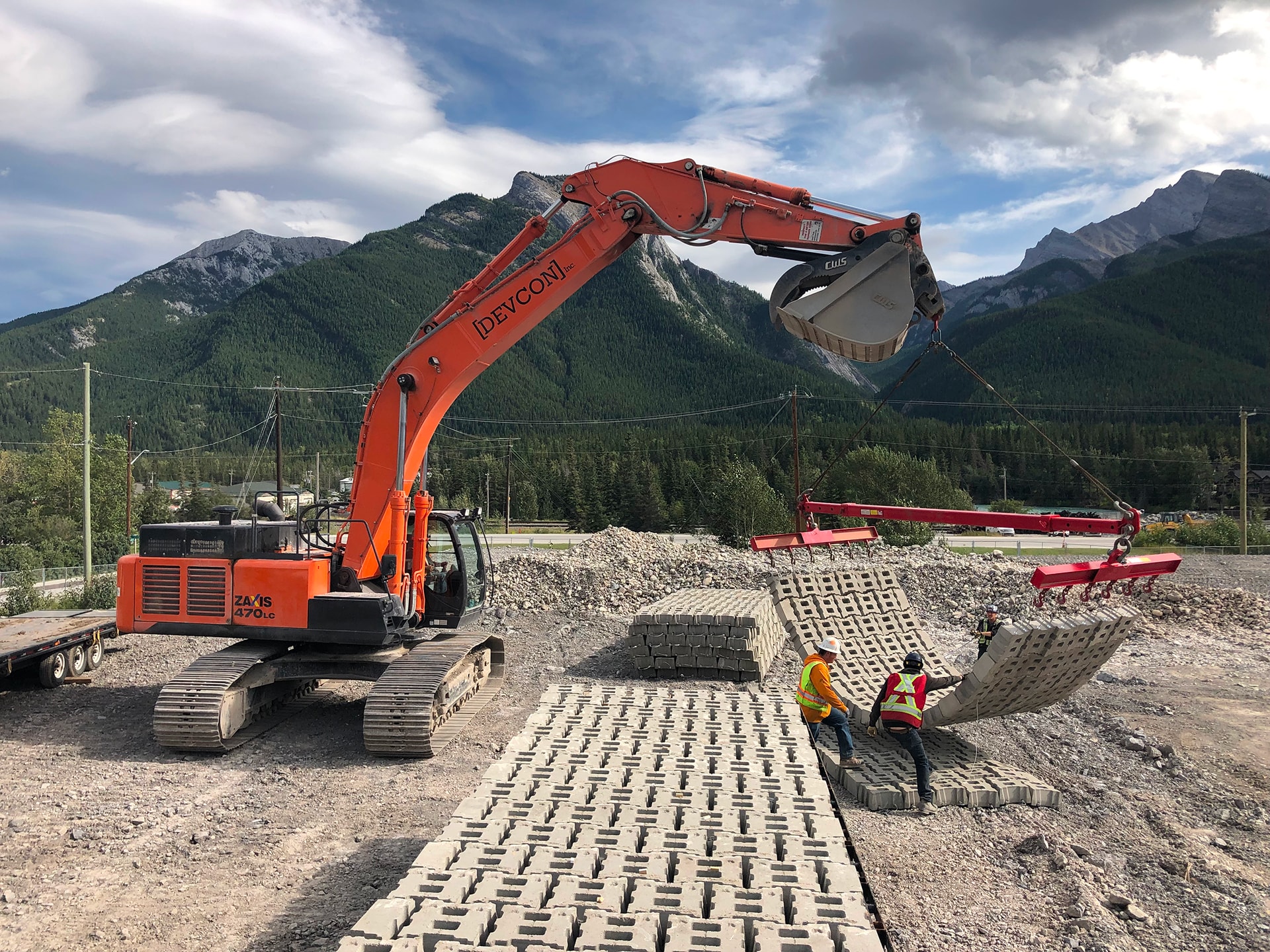 Devcon reinforced the creek banks with heavy riprap armour from the upstream reaches to the Bow River confluence, providing reinforcement for protection against erosion and high-flow events. Crews built a large sediment trap to control sediment and reduce downstream buildup. In high-risk areas—especially beneath channel crossings—they installed articulating concrete mattresses for flexible, durable reinforcement. We upgraded the site infrastructure, redesigning and installing a new pedestrian bridge to ensure safe public access. In addition, crews constructed a debris-retention structure to prevent large materials from blocking the channel or damaging downstream structures during peak flows.